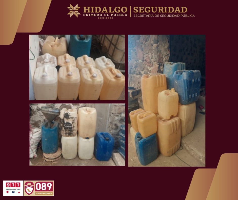 Derivado de trabajos de inteligencia y coordinación interinstitucional, la Secretaría de Seguridad Pública de Hidalgo (SSPH), en conjunto con la Procuraduría General de Justicia del Estado de Hidalgo (PGJEH), la Secretaría de la Defensa Nacional (Sedena) y la Guardia Nacional (GN), logró el desmantelamiento de un punto utilizado para el almacenamiento y venta ilegal de hidrocarburo, así como para el resguardo de vehículos con reporte de robo, en la colonia Boxthó, municipio de Alfajayucan.