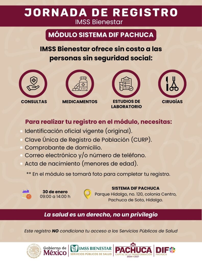 El Sistema para el Desarrollo Integral de las Familias (DIF) Pachuca se suma a las acciones para la protección y el bienestar de la población, mediante la realización de una Jornada de Vacunación y Registro a IMSS Bienestar, dirigida principalmente a personas que no cuentan con seguridad social.
