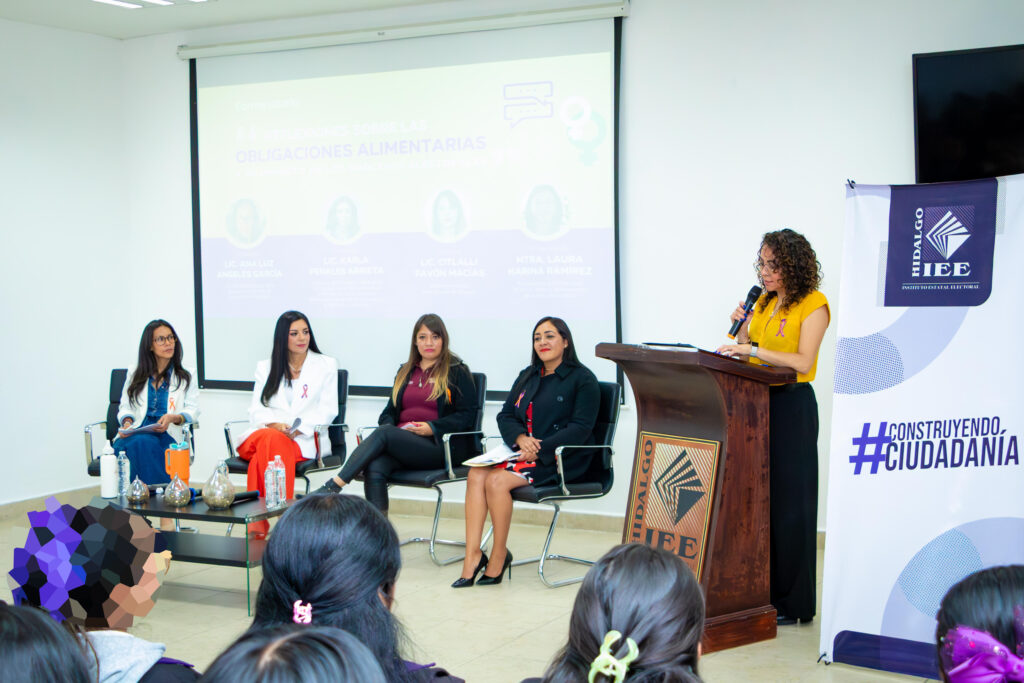 En el marco de la conmemoración del Día Internacional de las Mujeres y Niñas, que para este año 2026 se condujo bajo el lema “Derechos. Justicia. Acción. Para TODAS las mujeres y niñas”, desde el Instituto Estatal Electoral de Hidalgo (IEEH) se llevó a cabo el Conversatorio “Reflexiones sobre las obligaciones alimentarias y su impacto en los Procesos Electorales”. Dicha actividad fue desarrollada en las instalaciones de la Casa de la Mujer Hidalguense con la participación de Ana Luz Ángeles García, Coordinadora Estatal de la Asociación Civil Mamá, hija e hijo en libertad; Karla Perales Arrieta, Presidenta de la Comisión Permanente de la Niñez, la Juventud, el Deporte y la Familia del Congreso del Estado de Hidalgo; Citlalli Pavón Macías, Defensora de los Derechos de las Mujeres; y Laura Karina Ramírez Jiménez, Procuradora de Protección de Niñas, Niños y Adolescentes del Estado de Hidalgo como moderadora.