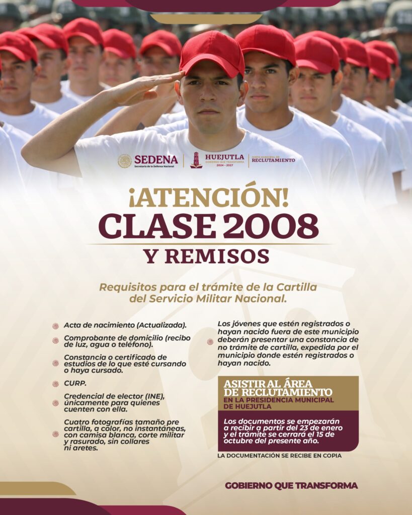 Con el objetivo de fortalecer la responsabilidad cívica y brindar certeza a las y los jóvenes en edad de cumplir con el Servicio Militar Nacional, el Gobierno Municipal de Huejutla, encabezado por el Lic. José Alfredo San Román Duval, dio a conocer el inicio del trámite de la Cartilla Militar para jóvenes de la Clase 2008 y remisos.