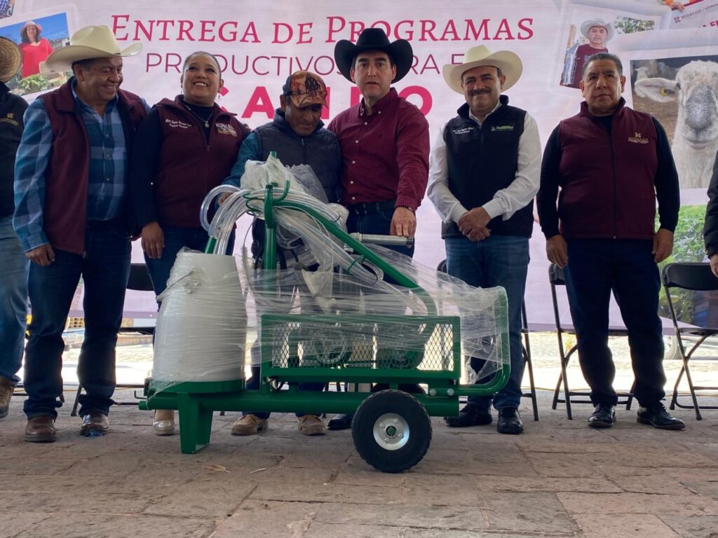 De igual manera, se entregaron semillas de avena, maíz y jitomate, desbrozadoras, ordeñadoras, bombas aspersoras, rollos de alambre y módulos de sombra, así como plántulas e hijuelos de maguey, insumos y herramientas contribuirán tanto al fortalecimiento de las unidades productivas como al bienestar de las familias beneficiarias.