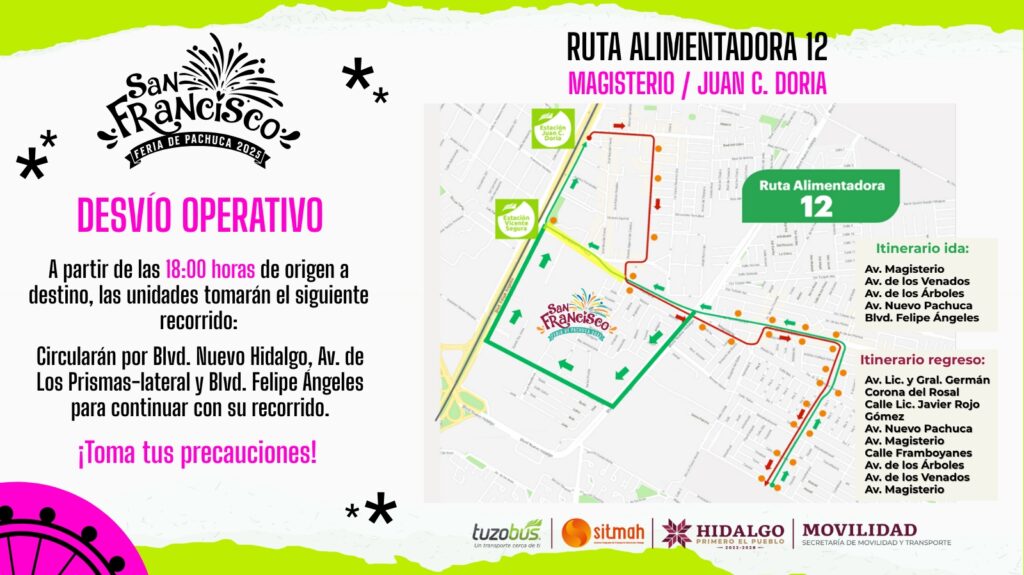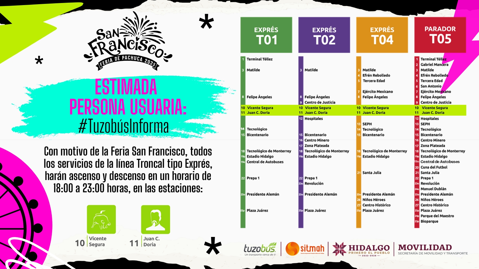 Con motivo de la Feria de San Francisco Pachuca Hidalgo 2025, la Secretaría de Movilidad y Transporte (Semot), a través de sus dos organismos sectorizados, el Sistema Integrado de Transporte Masivo de Hidalgo (Sitmah) y el Sistema de Transporte Convencional de Hidalgo (STCH), realizará operativos especiales del jueves 25 de septiembre al domingo 19 de octubre, con el objetivo de garantizar la movilidad y un servicio de transporte accesible.
