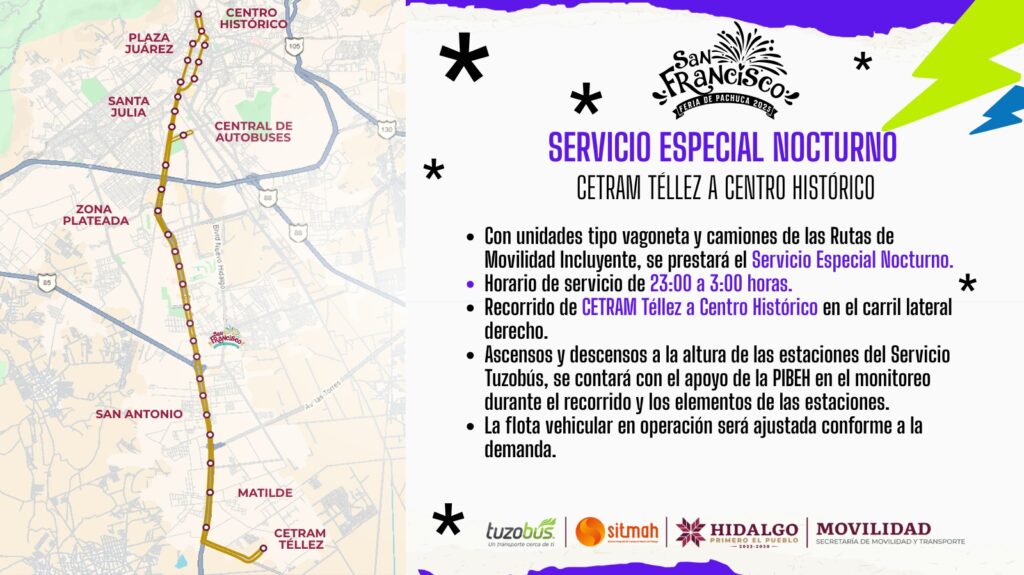 Se implementará un servicio especial nocturno con unidades tipo vagoneta, así como con las nuevas unidades de las Rutas de Movilidad Incluyente, que operarán desde el Centro de Transferencia Modal (Cetram) Téllez hasta Centro Histórico, realizando su recorrido por el carril lateral derecho de avenida Felipe Ángeles, haciendo ascensos y descensos a la altura de las estaciones del Tuzobús, con un horario extendido de 23:00 a 03:00 horas, manteniendo el costo de diez pesos ($10.00).